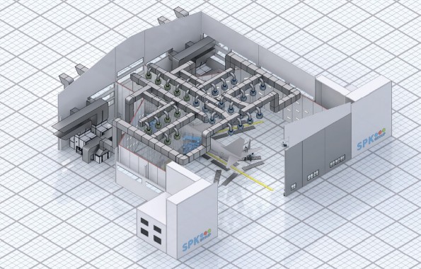 Основное технологическое оборудование представлено шестью приточно-вытяжными установками SPK-VU-75, укомплектованными компрессорно-конденсаторными блоками и хладагентом, утеплёнными воздуховодами, более чем сотней ламинарных форсунок с регулируемыми заслонками, воздушными клапанами для разделения зон подачи, специализированными решётками для вытяжки и дренажа, фильтрационными стенами, станцией для подготовки деминерализованной воды, локальными станциями очистки стоков и набором автоматической аппаратуры — частотными регуляторами, датчиками, сенсорной панелью с программным управлением SPK-PaintManager.